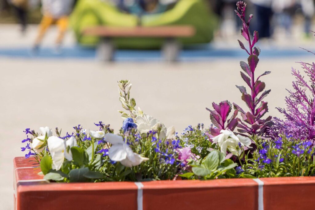 主に高齢の方で構成される地域のボランティア団体が、プランターの花の植替えを行います。また花壇では定期的に生活介護事業所の方と一緒にメンテナンスを行います。